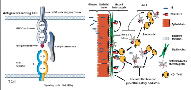 Thestaphylococcalenterotoxin A that generates such a rapid response acts as a superantigenwhich triggers a lot of nonspecific activity in the lamina propriaof the intestines. enhance interact w/ T cells and MHC. bursts of immune mediators in the connective tissue