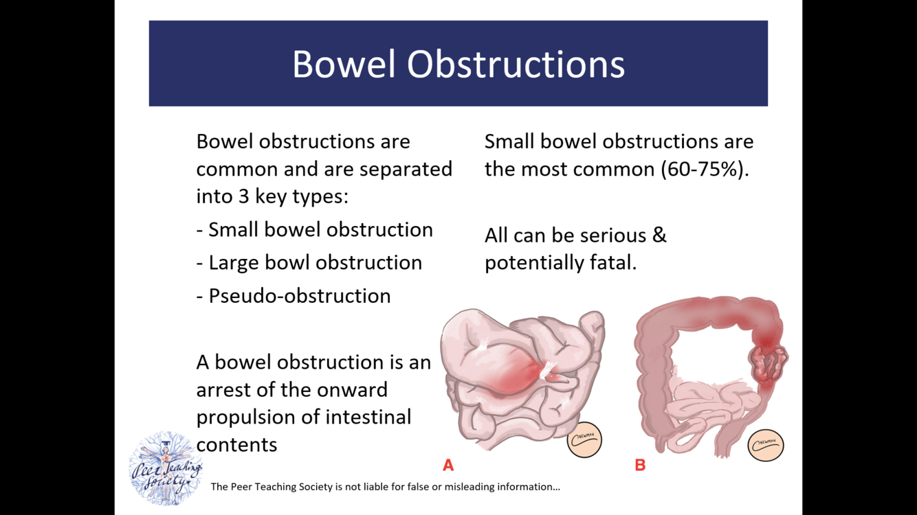 • A bowel obstruction is an arrest of the onward propulsion of intestinal contents. 3 types:
