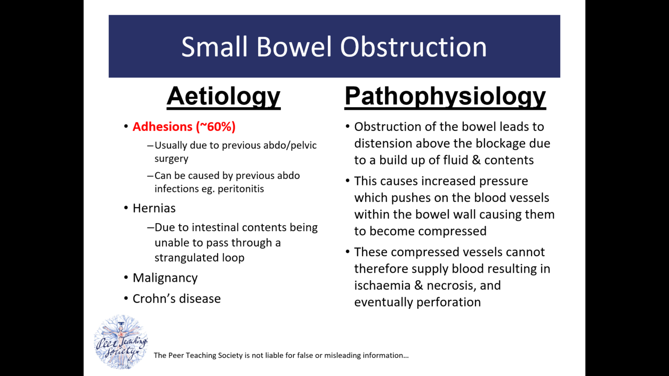 • ADHESIONS (~60%) - usually due to previous abdo/pelvic surgery, but can be caused by previous abdo infections, e.g. peritonitis