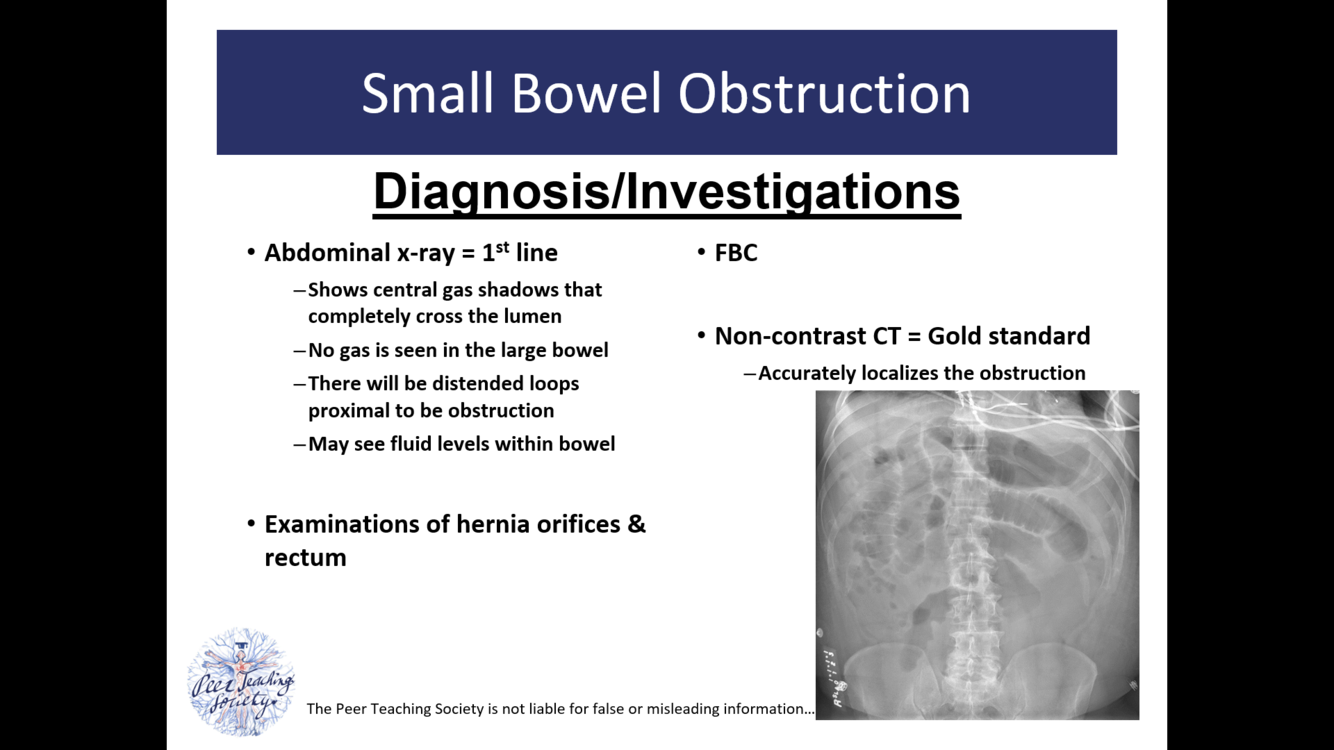 • ALL bowel obstructions are are diagnosed first by abdo X-ray and then by a confirmatory CT scan