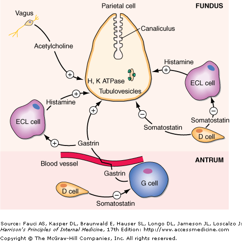 Somatostatin: binds to ECLs, G cells, and directly to parietal cells to inhibit GA secretion