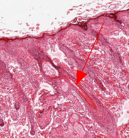 The upper surface of the lip consists of hairy skin and the red arrow is pointing to a hair follicle