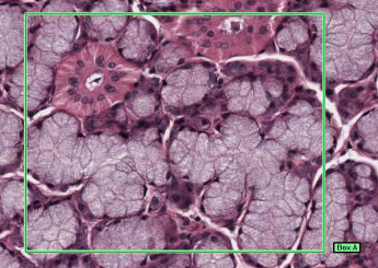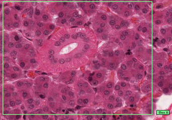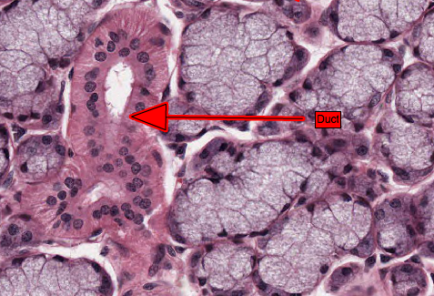 A darker staining duct of the sublingual salivary gland with simple cuboidal epithelium