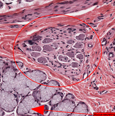 Parasympathetic nerve ganglion showing a collection of nerve bodies.