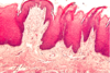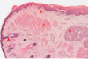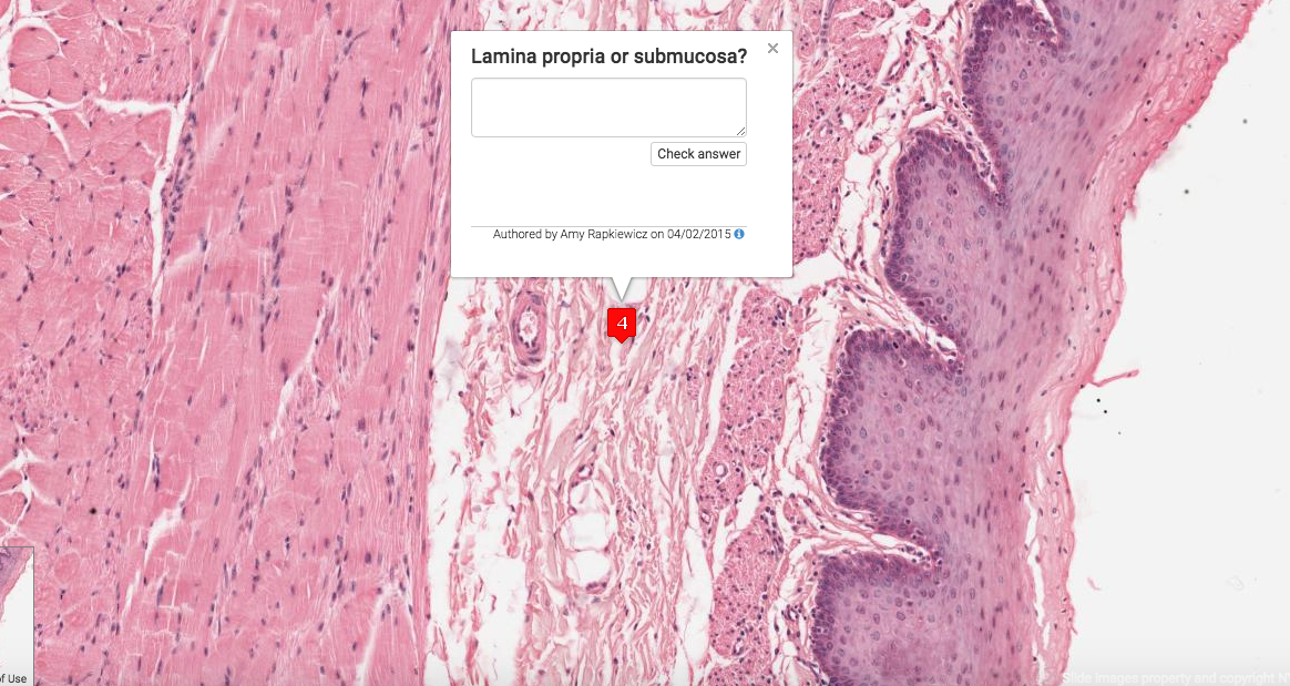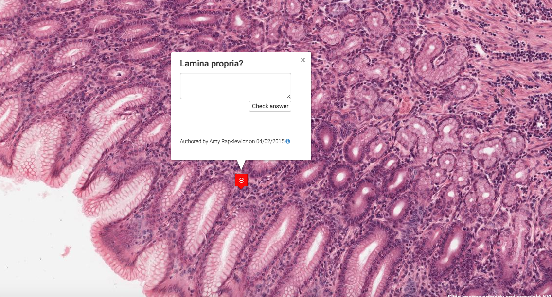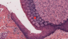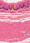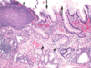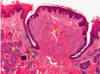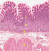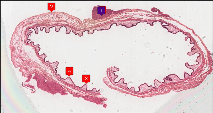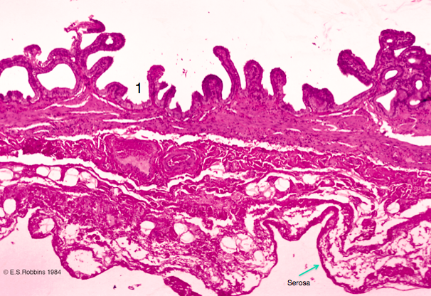 ·There’s not going to be a muscularis mucosa, which you saw in intestine. There’s not going to be a separate submucosa, there’s not going to be crypts, although sometimes there’ll be downgrowths (1) called Aschoff sinuses that are abnormal. And the surface has folds, but these are not really villi.