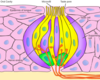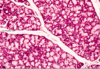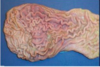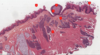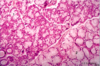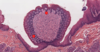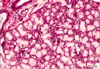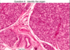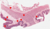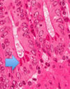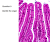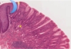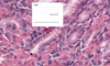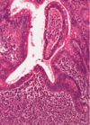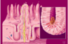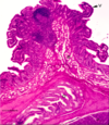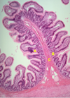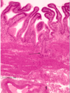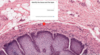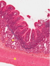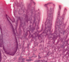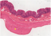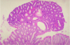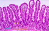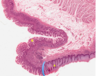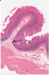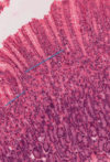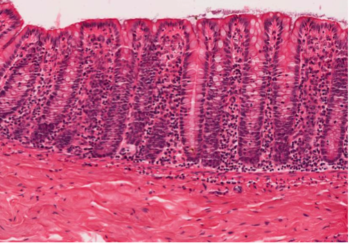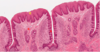 Straight tubular glands (like test tubes in a rack). You don’t really find Paneth cells as a general feature. There’s a smooth surface epithelium