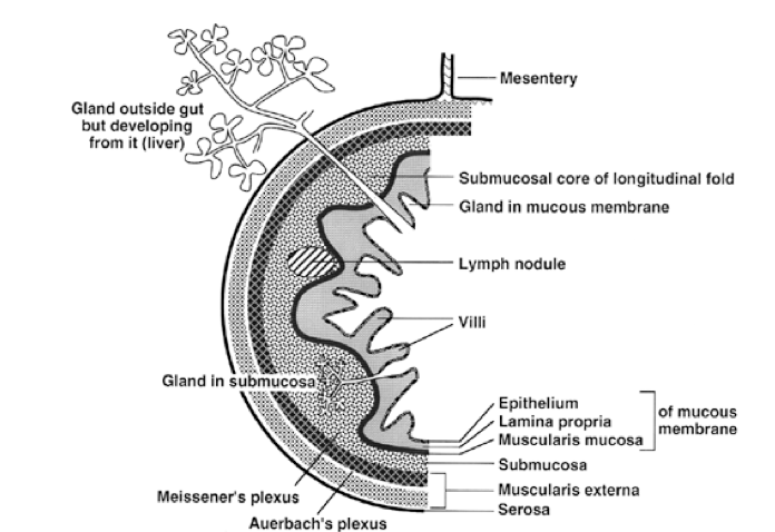 From the liver, bile obviously goes through those bile ductules into larger bile ducts that are found in the portal tracts out eventually to the gallbladder. Students confuse the gallbladder with the intestine, or the small intestine. So I’ve put some of the things that are not here, compared to the small intestine.