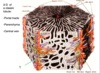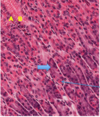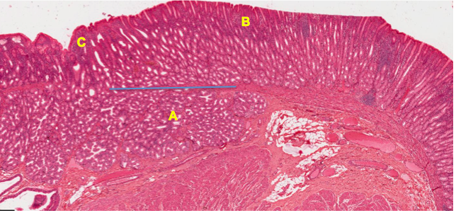 This is the gastroduodenal junction: you have surface mucus cells (C) but over here you’re going to have a simple columnar epith with goblet cells here (B). [Note, I think he pointed to the wrong ones because later in the lecture he says that the intestine has the goblet cells, so the correction has been applied here].