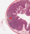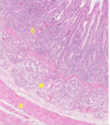 This one’s a little confusing – this is your pyloric stomach. Here’s your muscularis mucosa [line] which comes across and gets interrupted. Down here (A) we have glands below the muscularis mucosa, and I already told you there are only two places in the GI tract where you have submucosal glands: the esophagus and the duodenum.