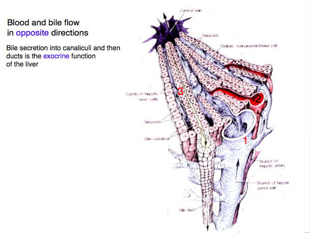 ·So blood is flowing toward the central vein (i.e. toward the black star shape), whereas the bile, which is begin formed in these bile canaliculi, here indicated sort of diagrammatically as this green stuff, flows toward the portal tract.