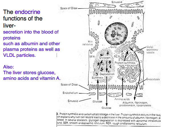 ·So the endocrine functions, secretion into the blood, including storing glycogen and secreting it as glucose (see arrows), making albumin, fibrinogen, prothrombin – again, all kinds of interesting things, including IgF1.
