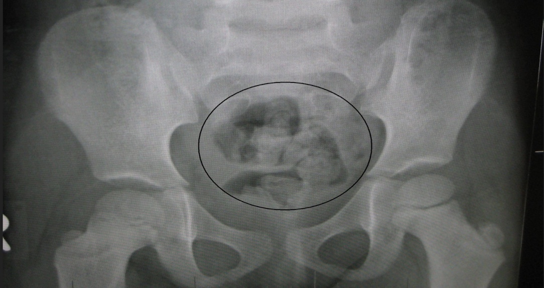 What does fecal matter look like on XRAY?
