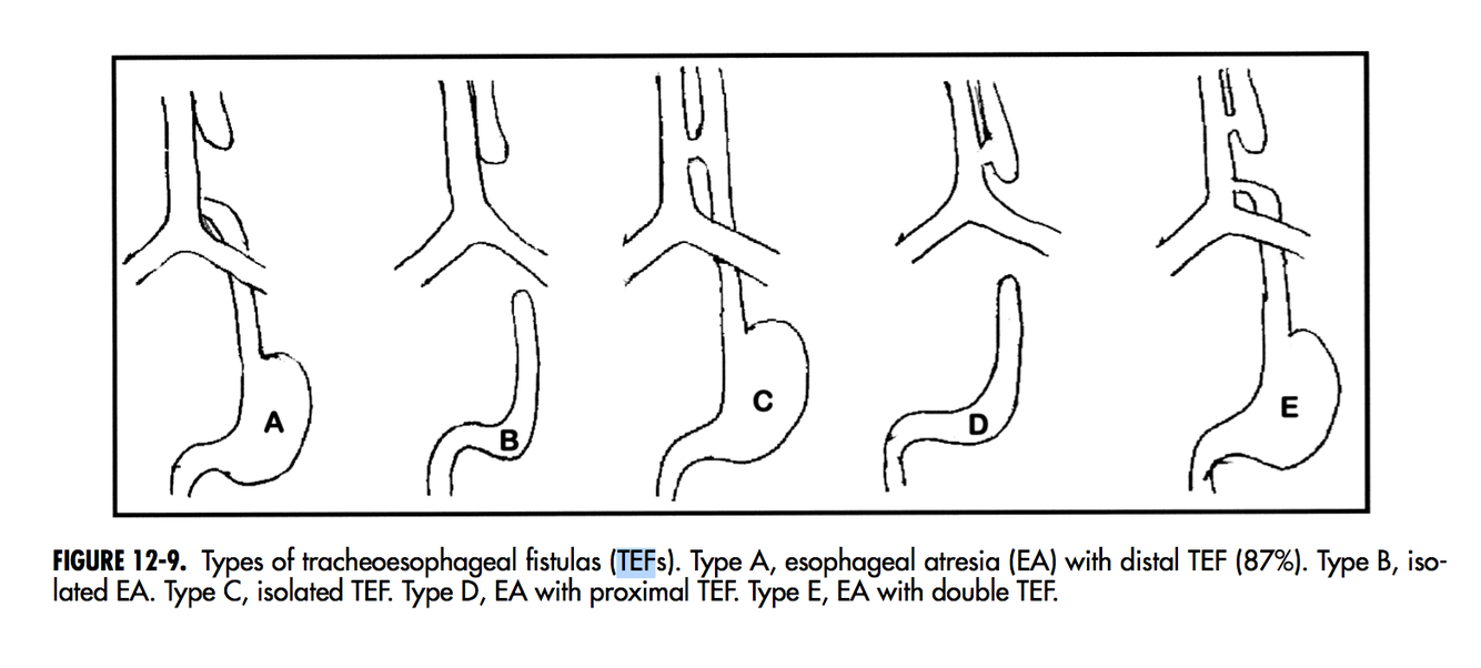 -h/o of polyhydramnios -vomiting w/ 1st feeding -choking/coughing & cyanosis -recurrent aspiration pneumonia