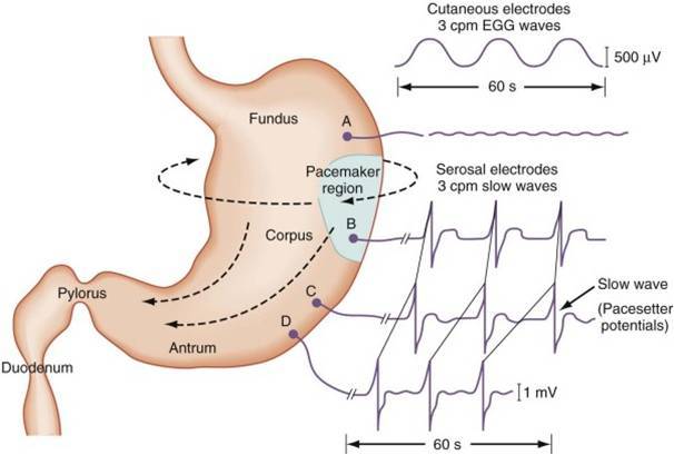 Gastric contractions are modified by ACh and gastrin, which cause increased amplitude and duration of contractions