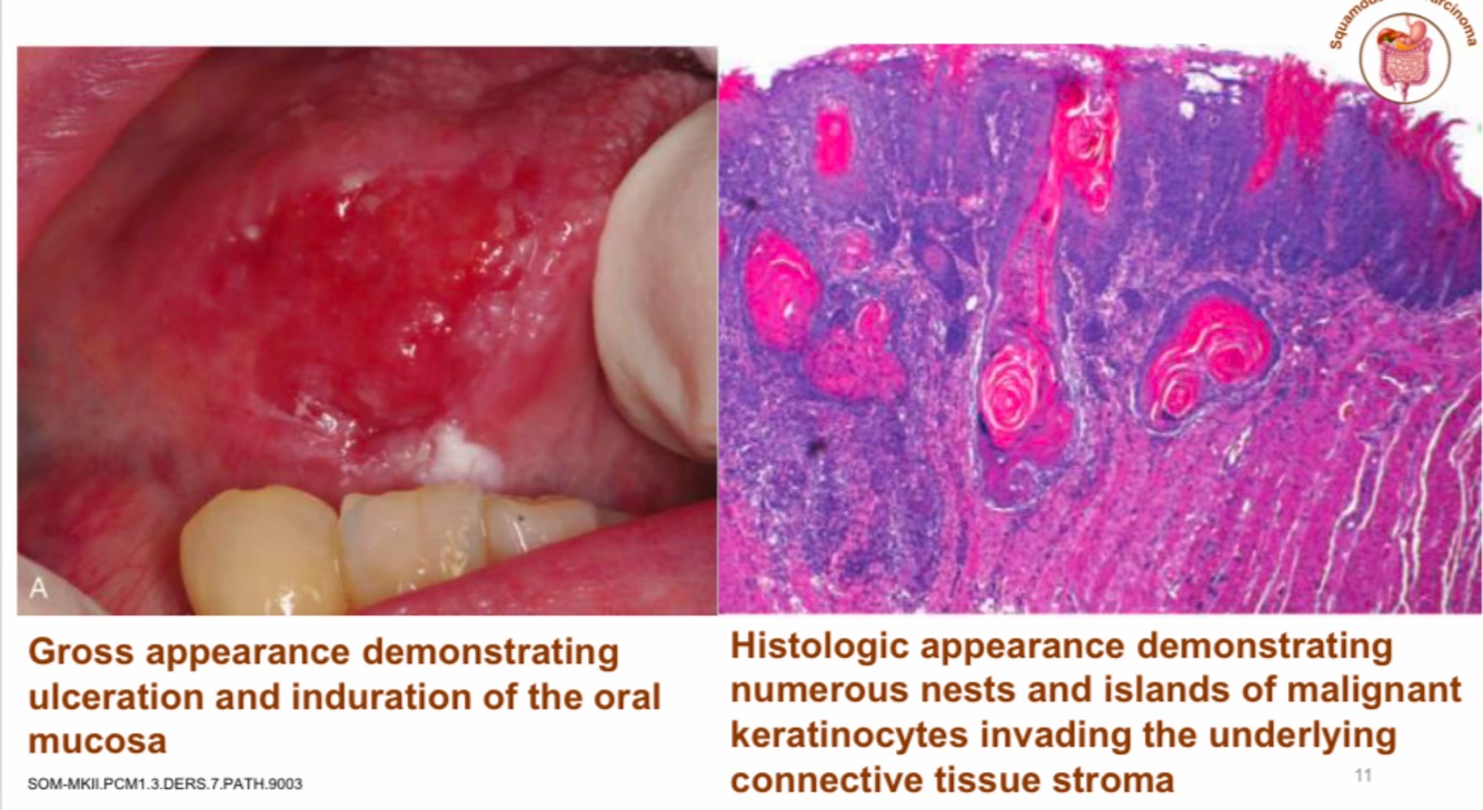 Describe the histology and gross appearance of oral squamous cell carcinoma