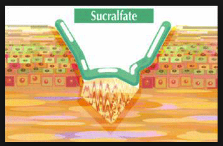 Binds to ulcer base –> physical protection, allows Bicarb secretion to re-establish pH gradient in the mucous layer.