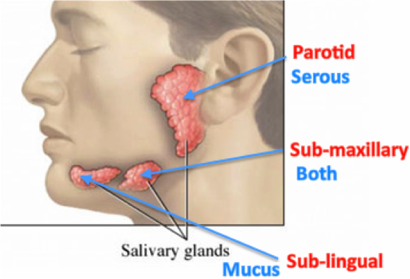 Saliva is secreted from 3 pairs of ducted, exocrine salivary glands: