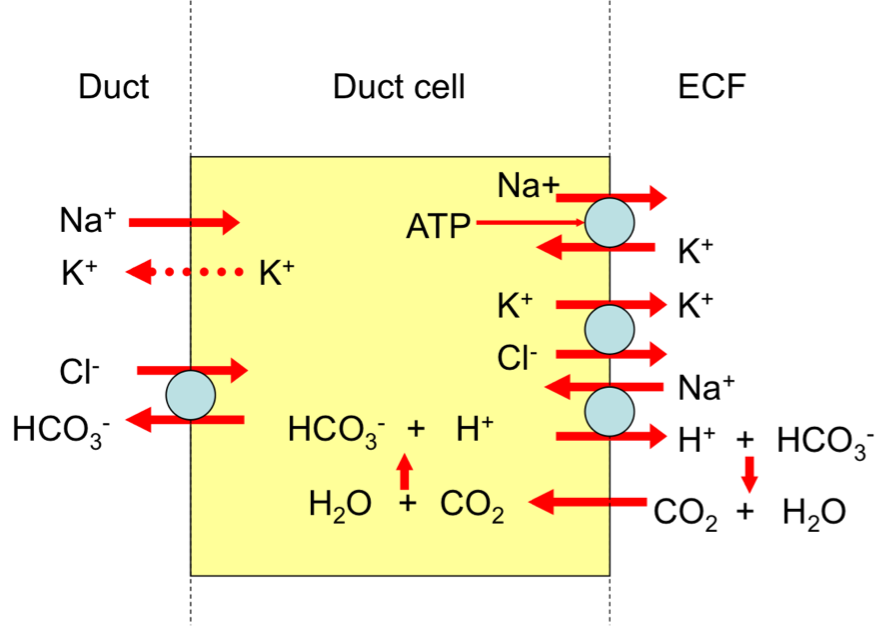 Ductal Modification: Duct cells then remove Na+ and Cl-, and add HCO3-.