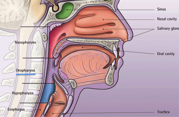 The oropharynx lies behind the oral cavity and forms the portion of the pharynx below the nasopharynx but above the laryngopharynx. It extends from the uvula (extension at the back of the soft palate), to the level of the hyoid bone.