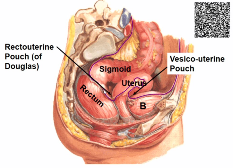the lowest point in the peritoneal cavity where pathological fluid can collect and can be aspirated to test