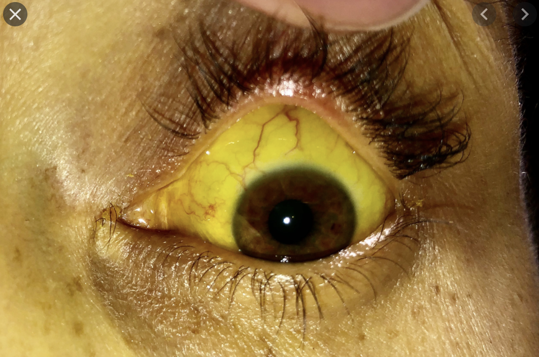 During an abdominal examination we need to examine the eyes. Icterus (commonly known as jaundice) is something that we may see. What is this and what is a common cause of this in the GIT?