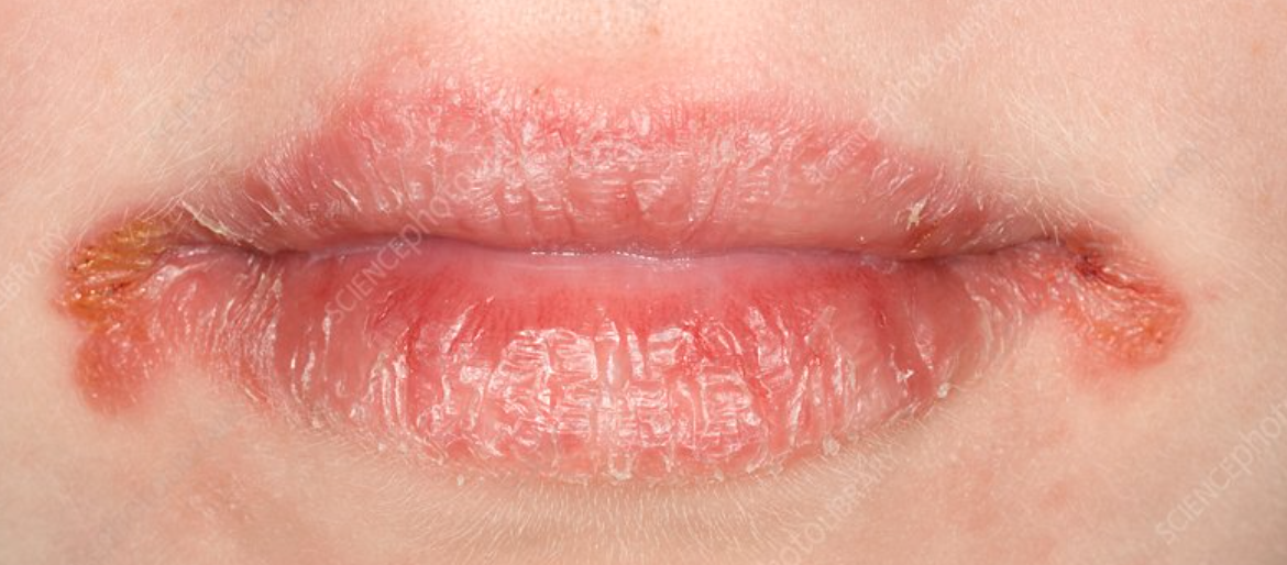 During an abdominal examination we need to examine the face. Angular stomatitis is something that we may see. What is this and what is a common cause of this in the GIT?