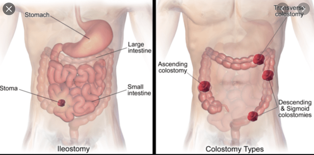 1 - ileostomy (can be on either side of abdomen)