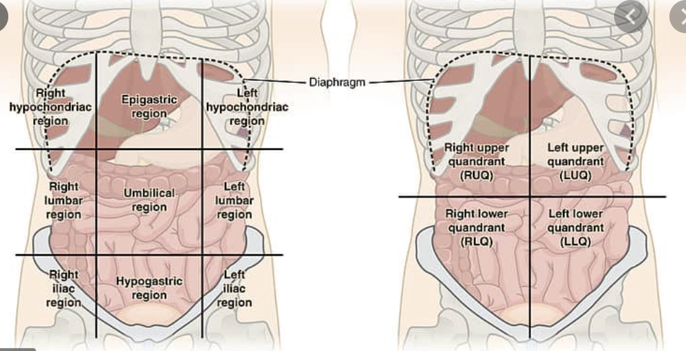 When examing a patient in an abominal examination, where would we need uncovering and access to on the front of the body?