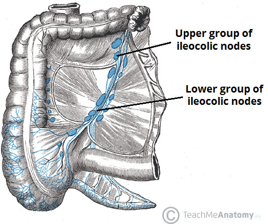 Lymphatic fluid from the appendix drains into the lymph nodes within the mesoappendix and into the ileocolic lymph nodes (which surround the ileocolic artery).