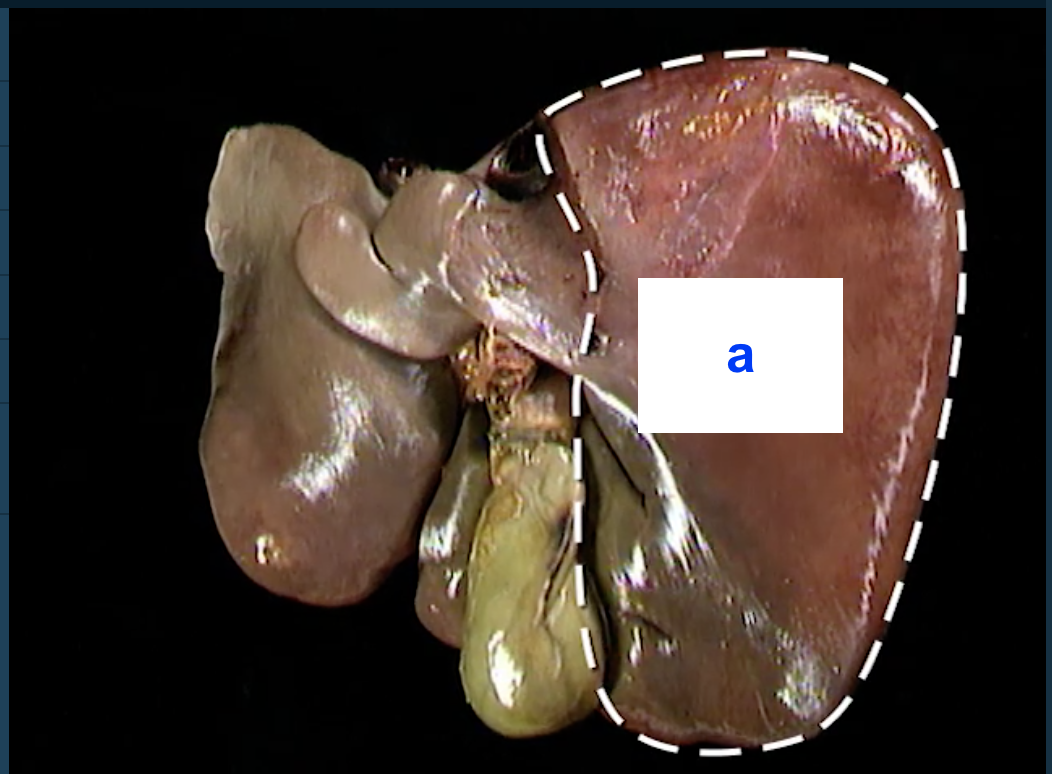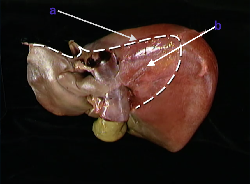 The attachment site of the liver to the right diaphragm is known as the bare area. The liver surface under the bare area is thought to lack a peritoneal covering in adults