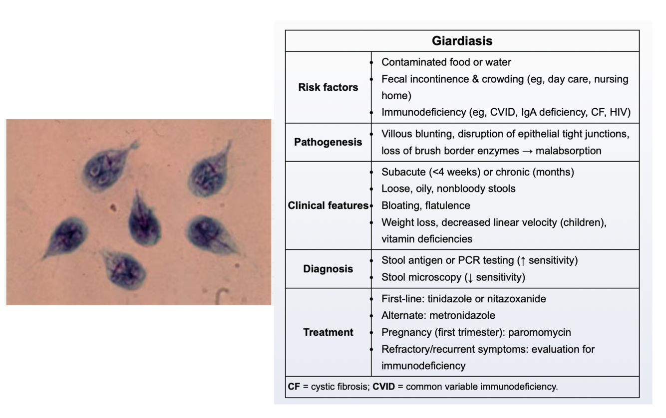 Pear-shaped, flagellated trophozoites with a ‘smiley-face’ appearance or oval cysts seen in stool samples.