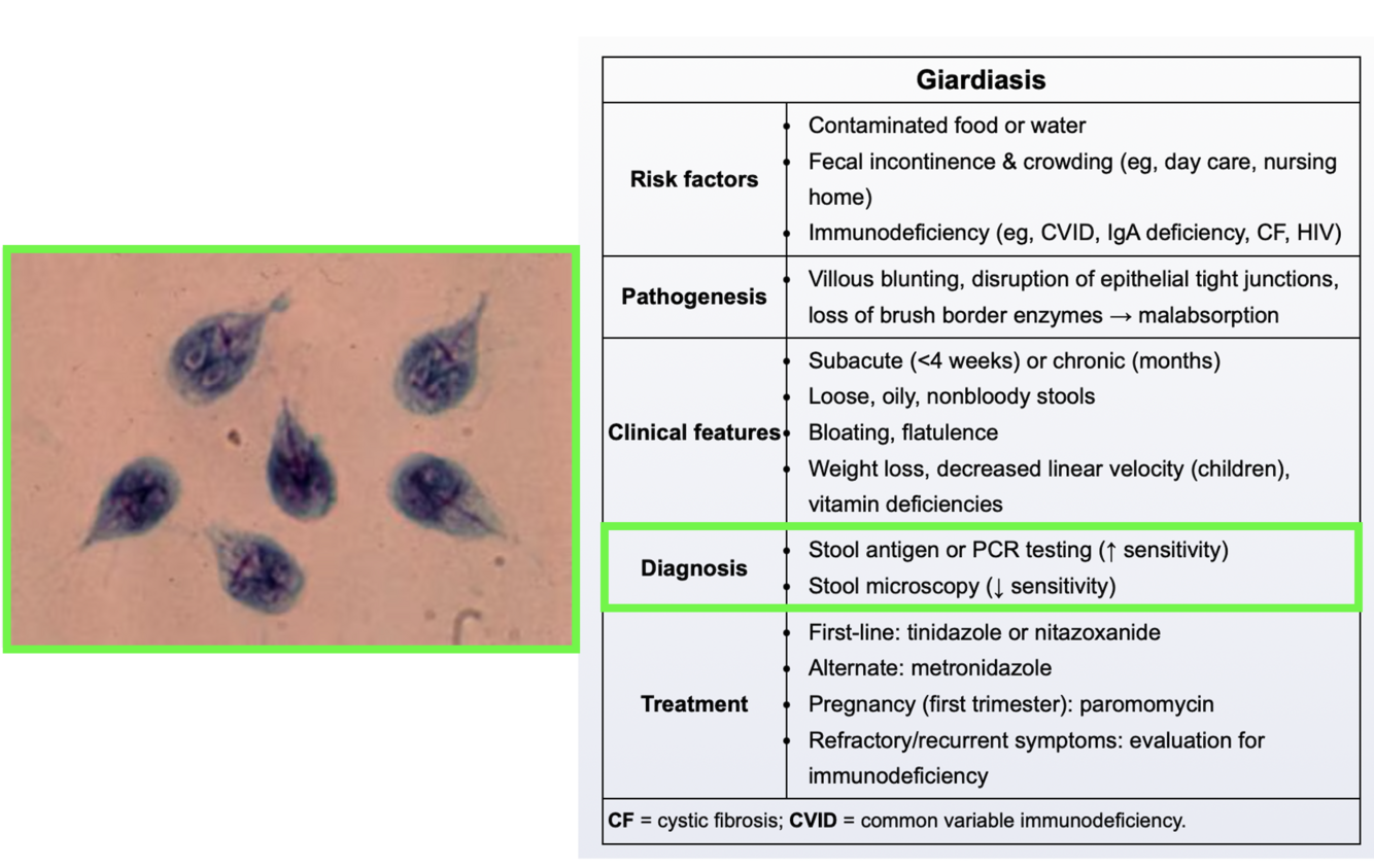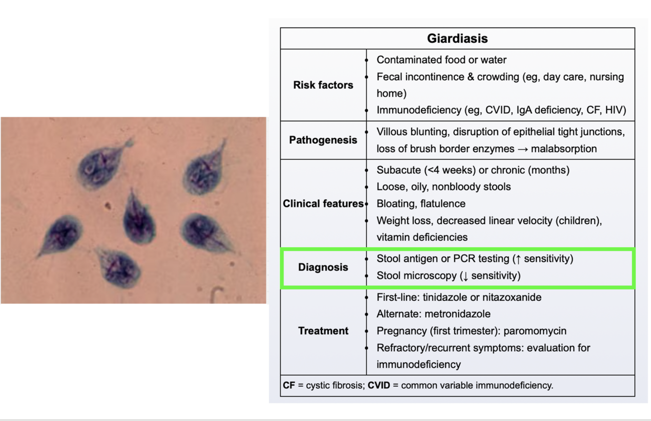 Which diagnostic tests are used for Giardia?