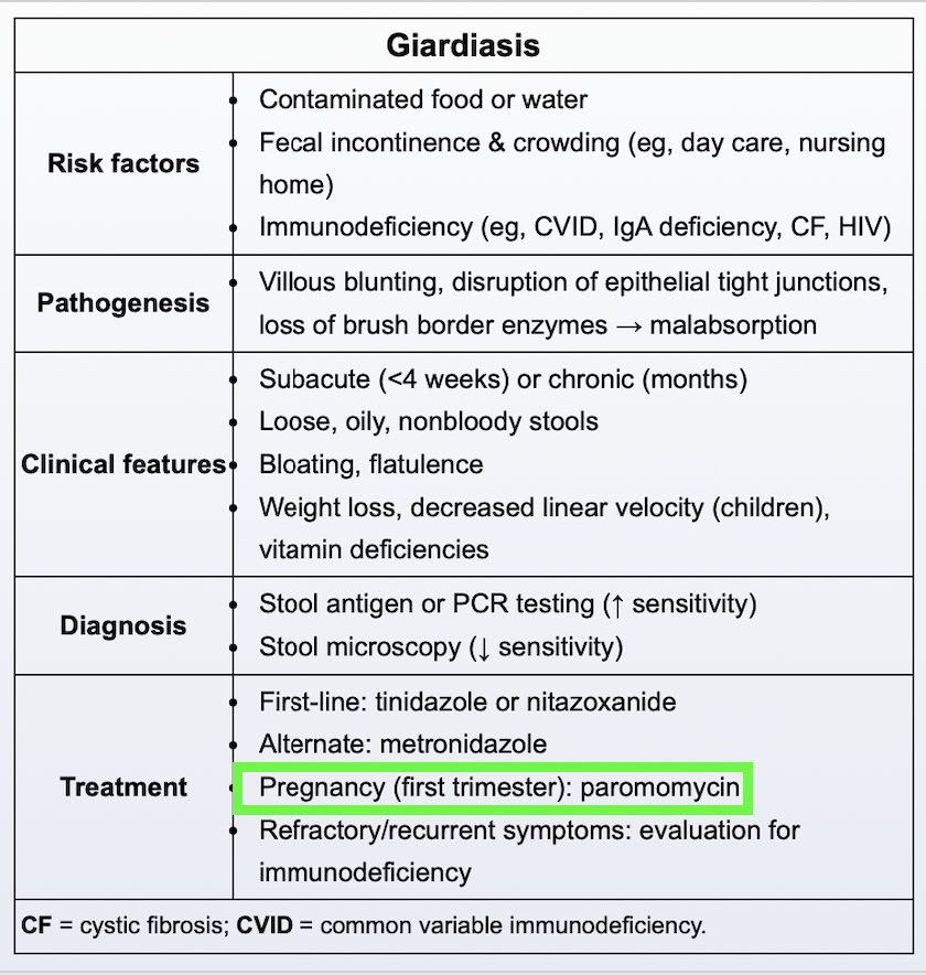 What is the preferred treatment for Giardia in pregnant women (first trimester)?