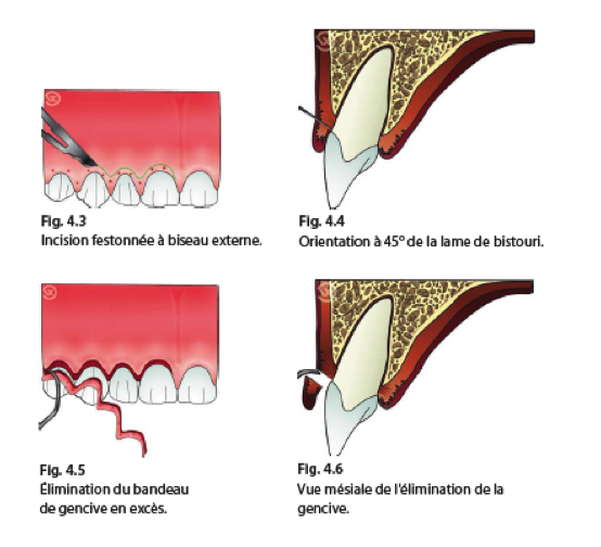 Principe : éliminer par éviction gingivale la gencive libre en excès. 2 techniques : biseau externe GBE ou interne GBI.