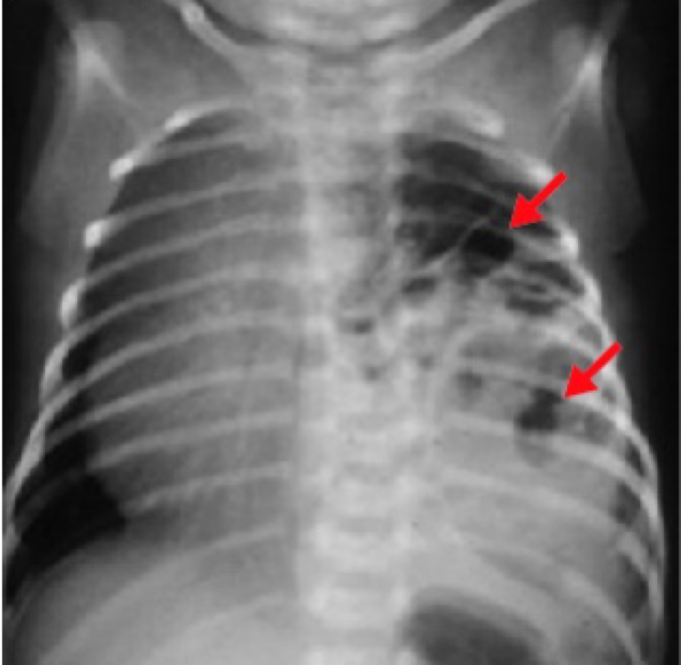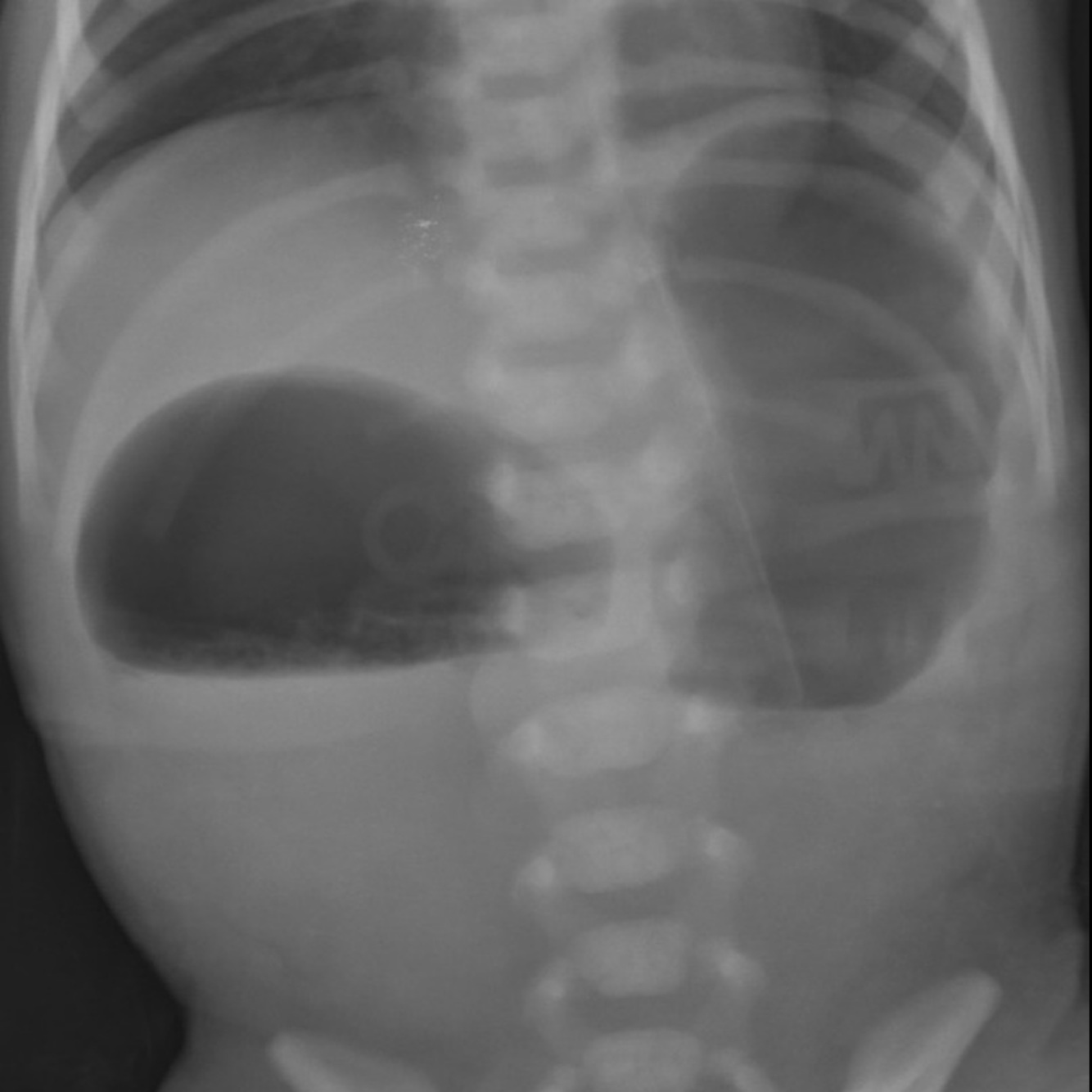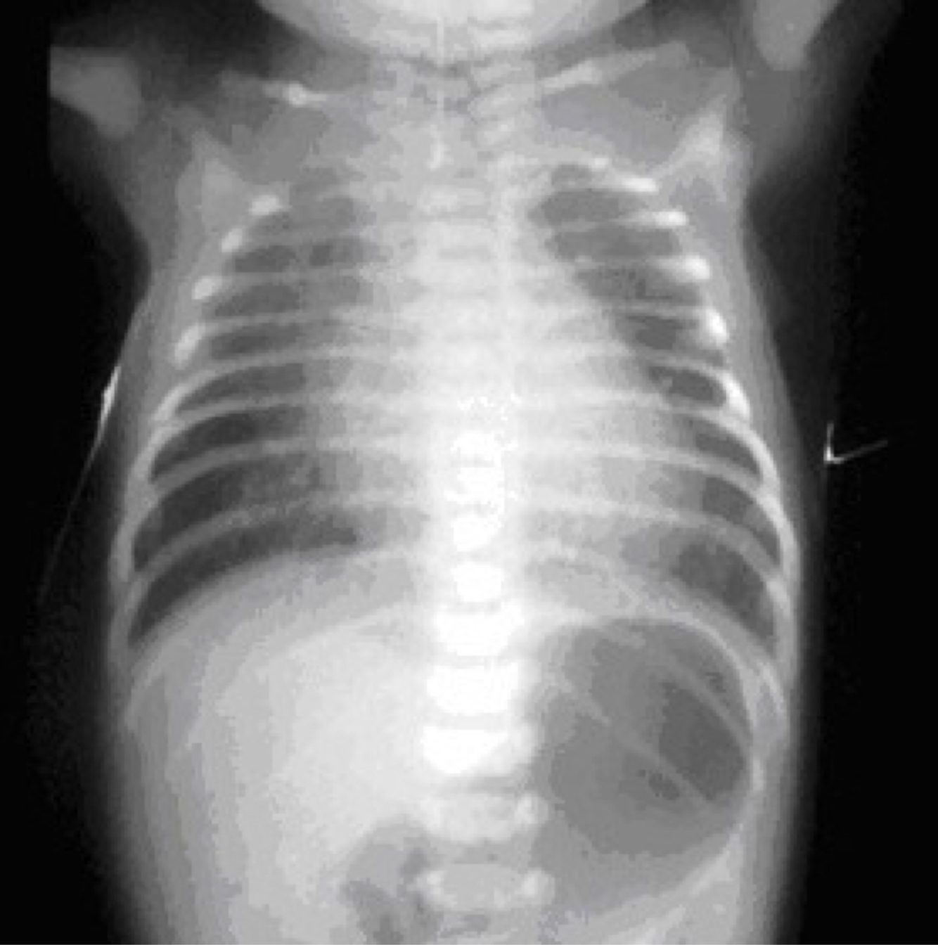 Tracheoesophageal fistula : distended gastric bubble and the nasogastric tube that has not reached the stomach but has rather coiled in the mediastinum