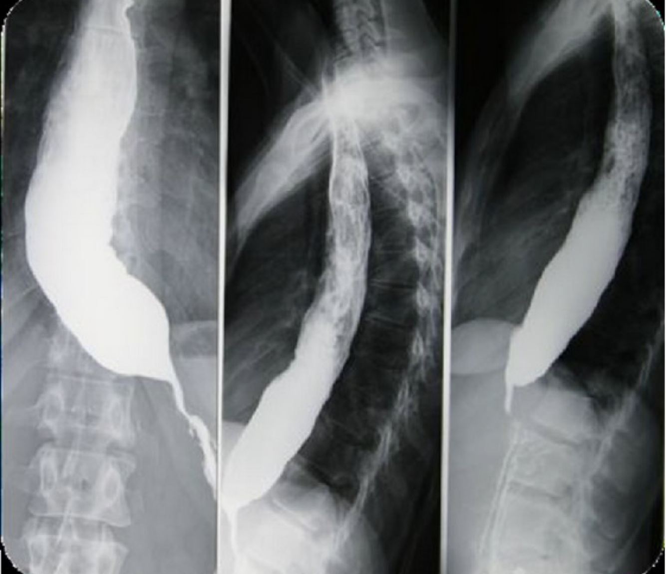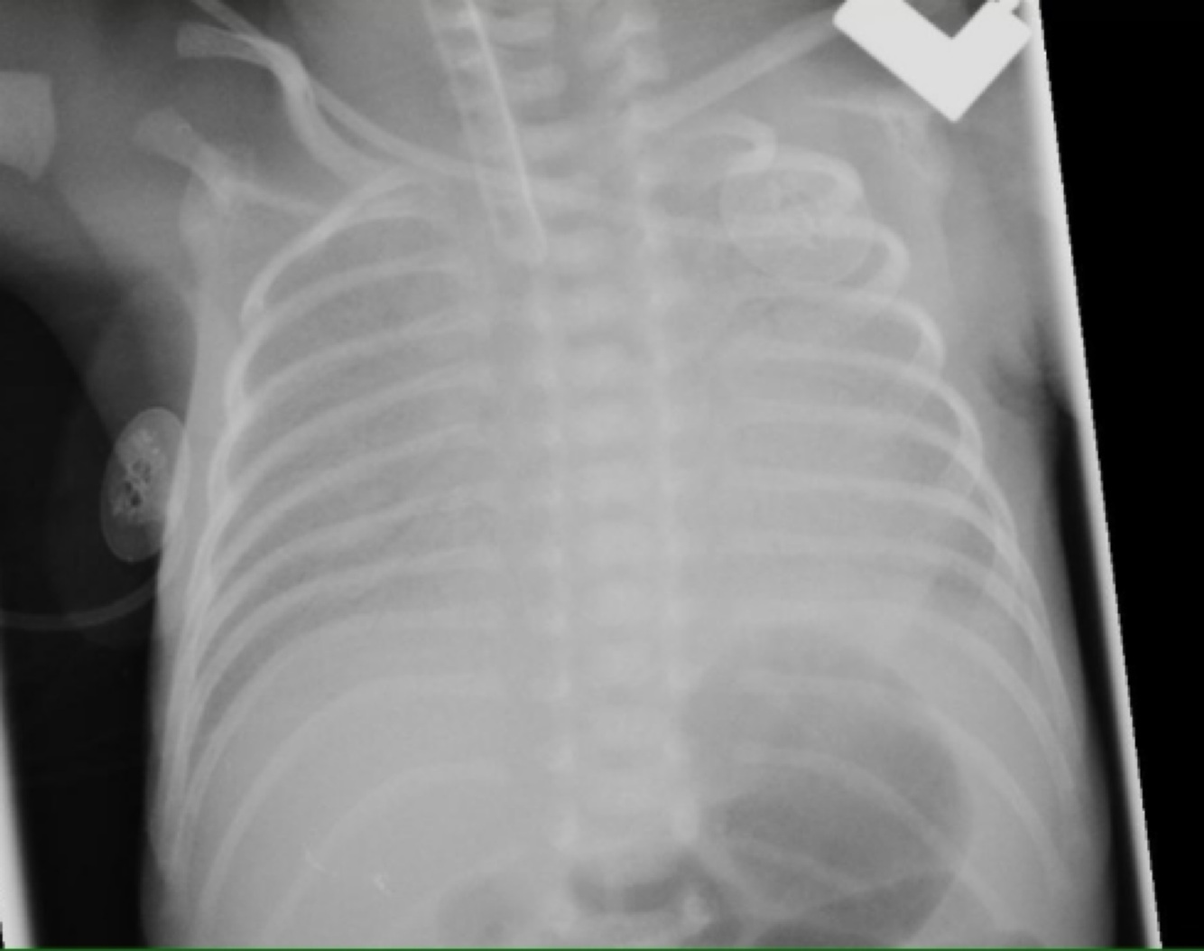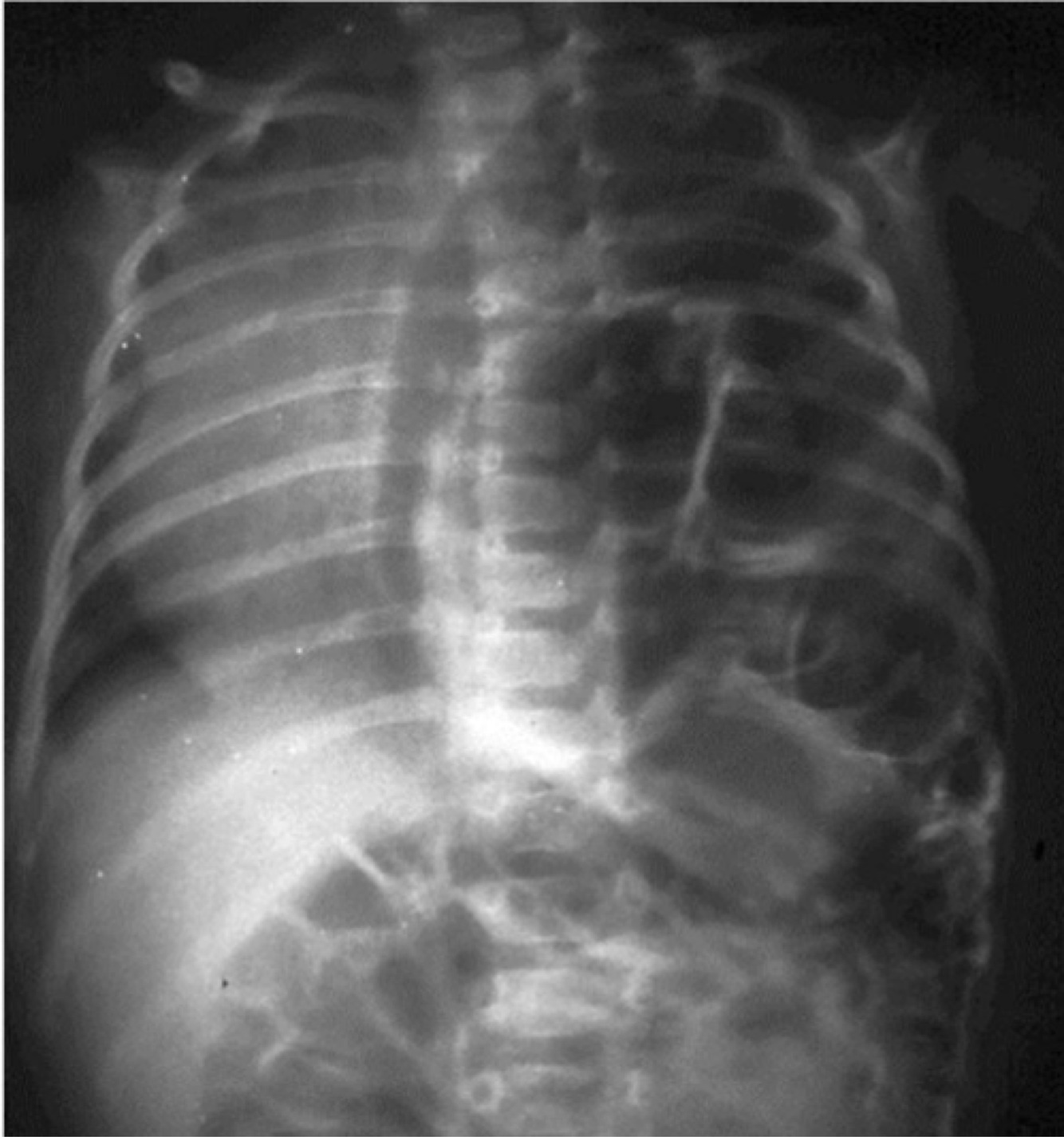 Tracheoesophageal fistula : distended gastric bubble and the nasogastric tube that has not reached the stomach but has rather coiled in the mediastinum