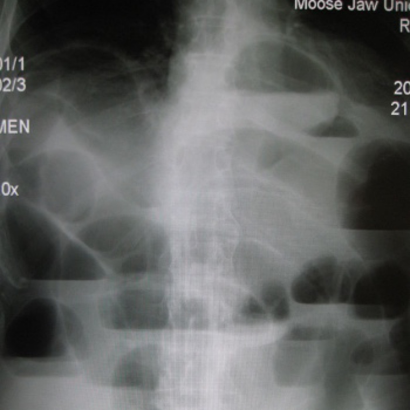 small bowel obstruction. Dilated loops of small intestine, seen in the x-ray image of the abdomen,