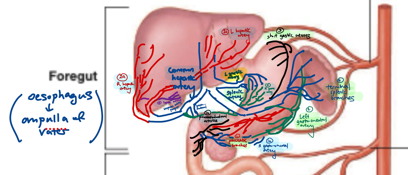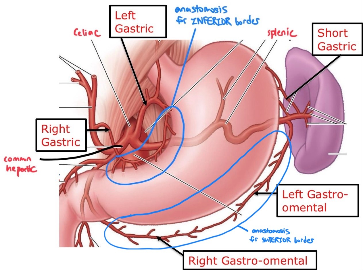 what arteries form the anastomosis which supplies the inferior border of stomach