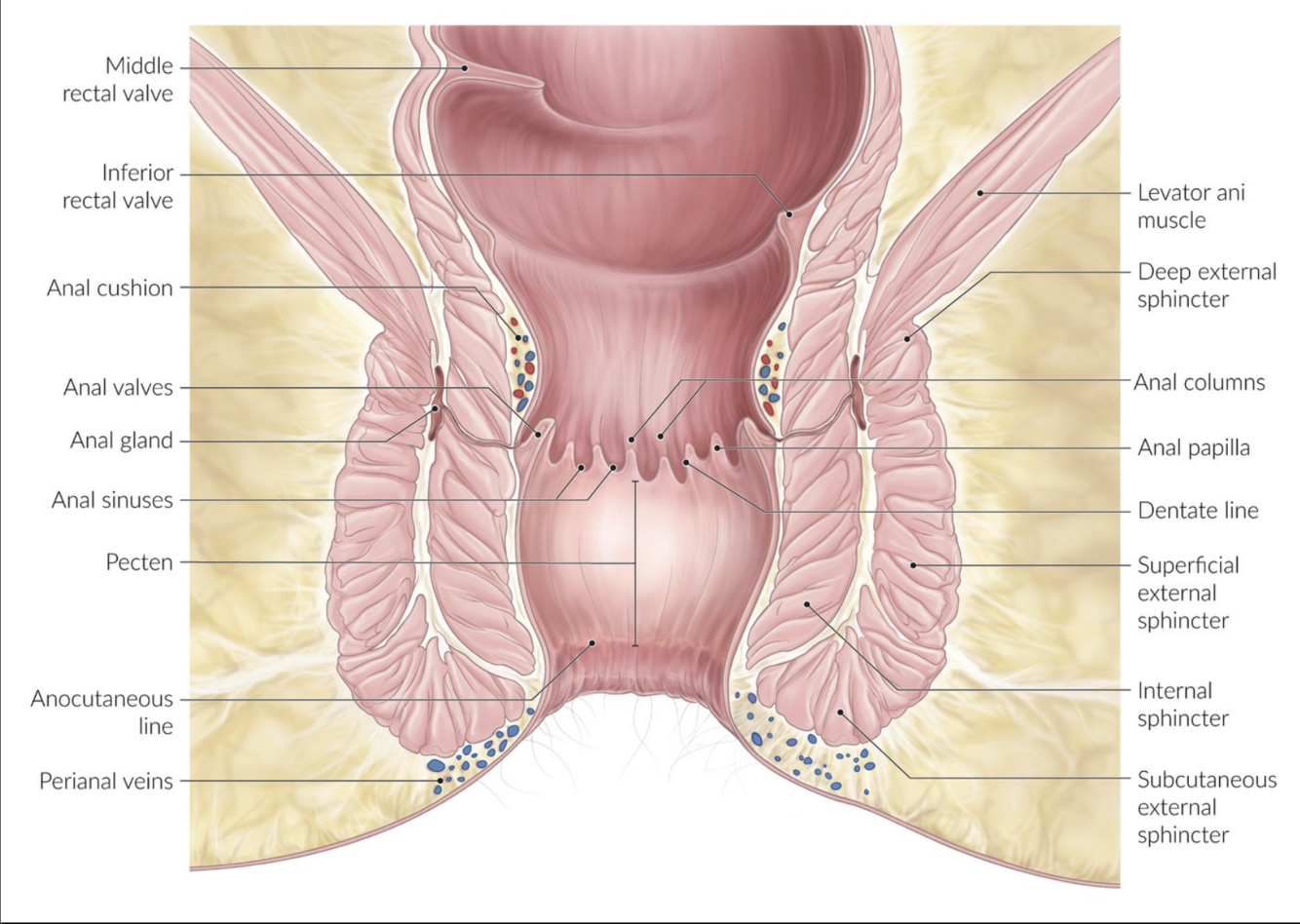 * IAS and EAS: controls passage of stool during bowel movements