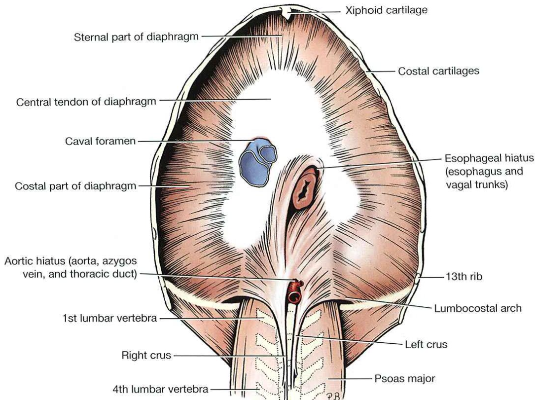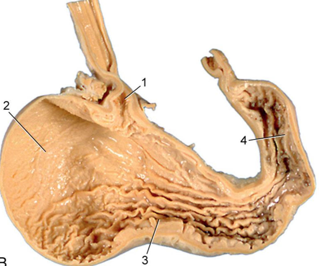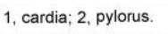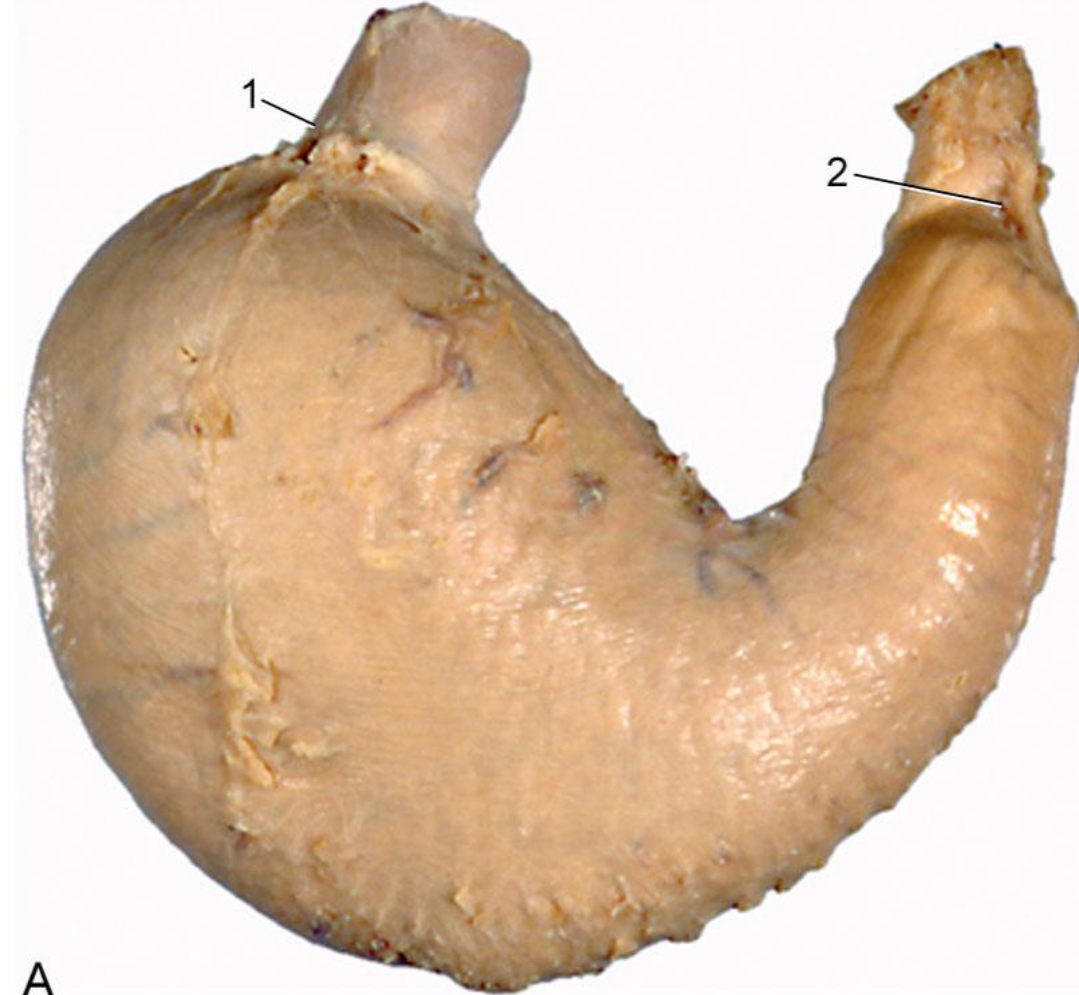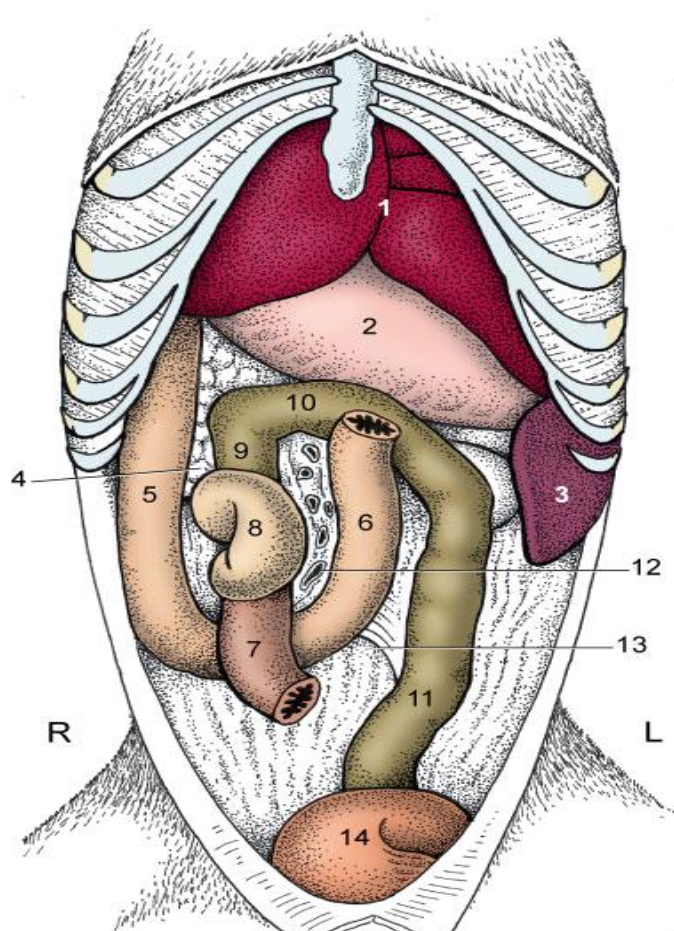 Dorsally and laterally lies in contact with the liver and medially by the pancreas