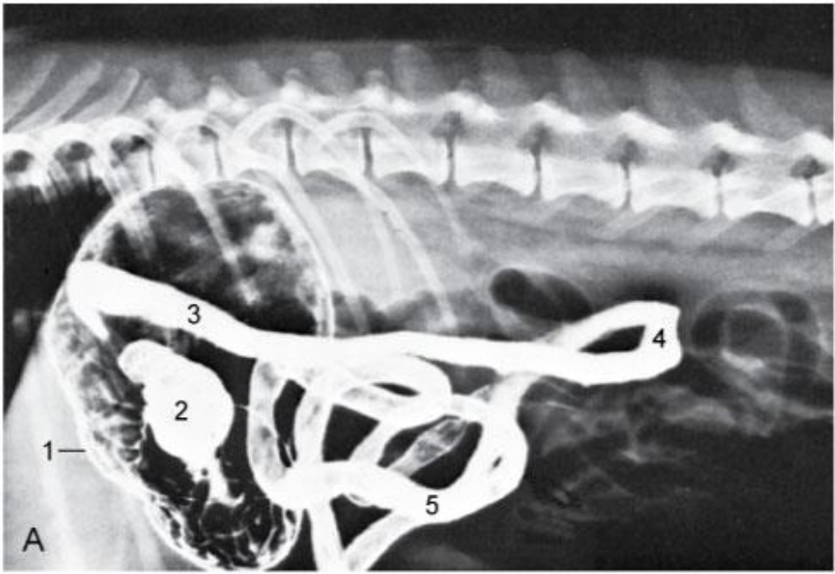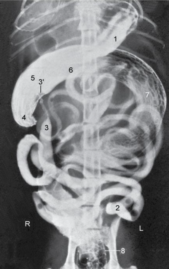 Runs caudally (right side) – Descending duodenum- level of tuber coxae- makes a U- turn –runs obliquely-craniosinistrally (leftside)- continues as the ascending duodenum
