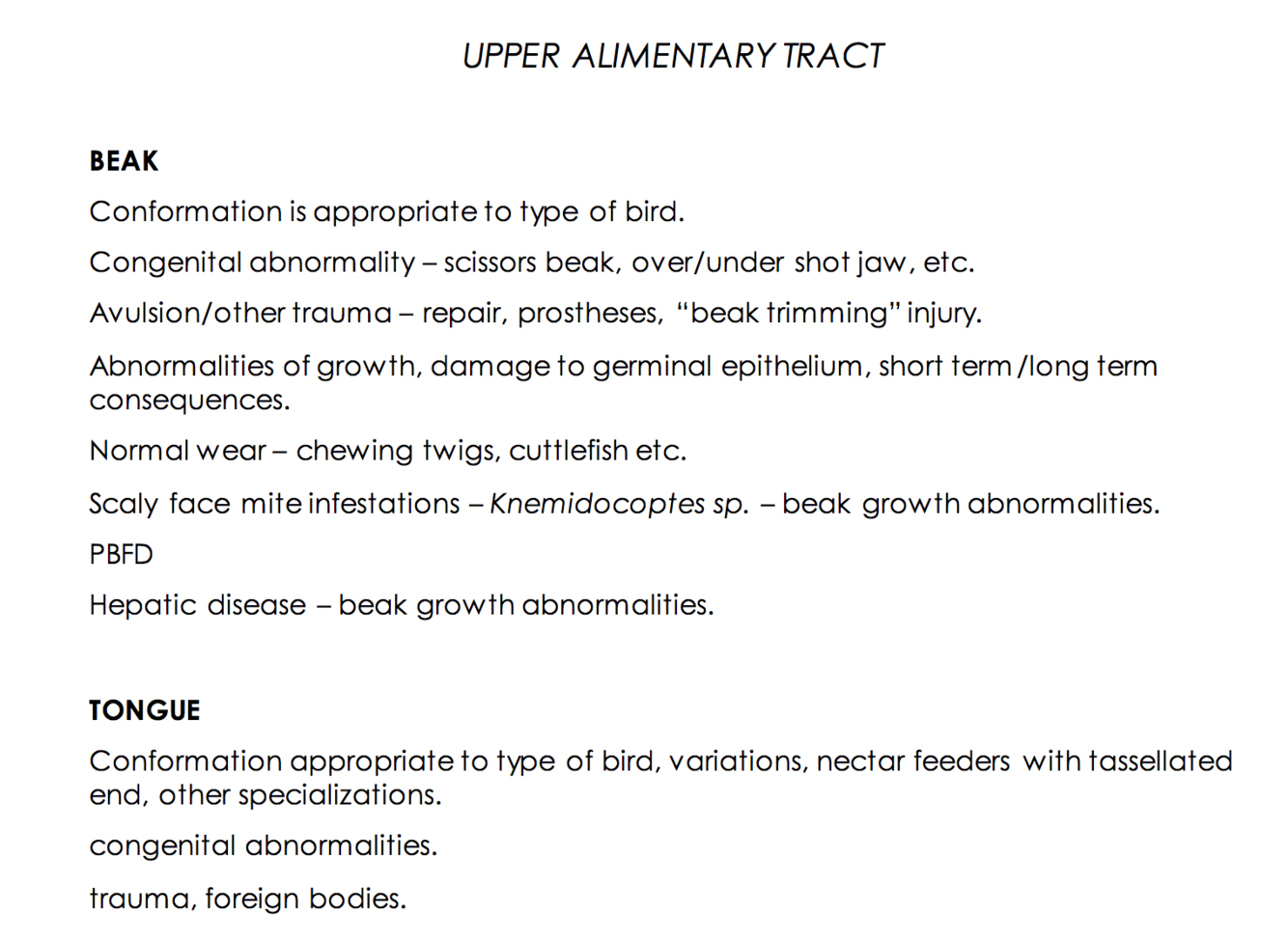What are you looking for in the upper alimentary tract– tongue and beak to ensure health in birds?
