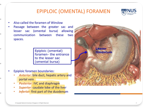 The epiploic foramen is superiorly bounded by the caudate lobe of the liver, inferiorly bounded by the first and superior part of the duodenum, anteriorly bounded by the hepatoduodenal ligament which conveys the portal triad (portal vein, common bile duct and hepatic arteries) and finally posteriorly bounded by the inferior vena cava and the right crus of the diaphragm, which are both retroperitoneal