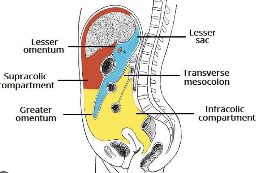 The lesser sac (also known as the omental bursa) is found posterior to the stomach and anterior to the pancreas, which is retroperitoneal. The lesser sac is continuous with the cavity in the greater omentum and fluid may flow into the cavity of the greater omentm from the lesser sac. To the right of the epiploic foramen, one will find the right subhepatic space, the hepatorenal pouch (otherwise known as the Morison’s pouch) and inferiorly, the right paracolic gutter. These are all compartments of the greater sac of the peritoneal cavity