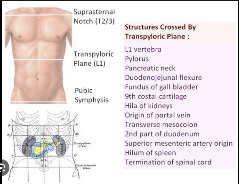 The transpyloric plane lies at the vertebral level of L1, demarcating the level of the pylorus of the stomach when a person is in the supine position. The fundus of the stomach is superior to the plane and will not be present in the radiographic investigation. The fundus lies posterior to the left 6th rib in the plane of the midclavicular line, while the transpyloric plane transects the 8th costal cartilage