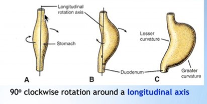 Foregut caudal to oesophagus dilates = stomach