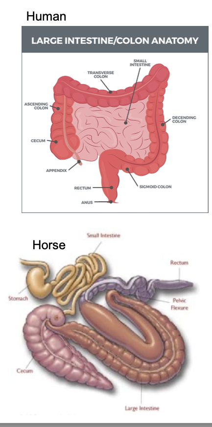 Large intestine (cecum (like the appendix in humans), ?, ?)
