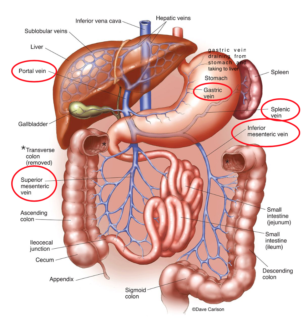 - nutrients absorbed from the gastrointestinal tract are delivered directly to the liver -> to be metabolized (drug), transformed for storage or allowed to pass into the systemic circulation