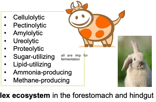 Cooperation among the species of microbes give rise to a * complex ecosystem * in the forestomach and hindgut