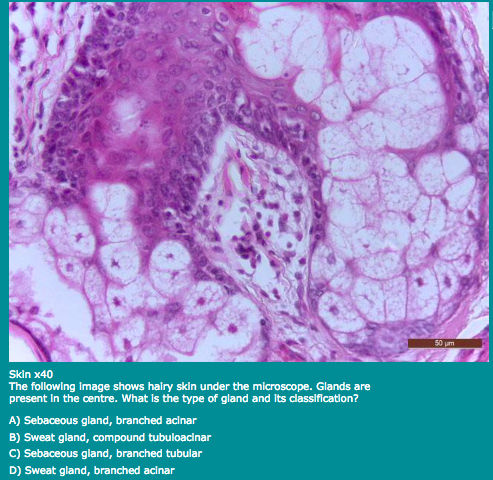 A) Sebaceous gland, branched acinar